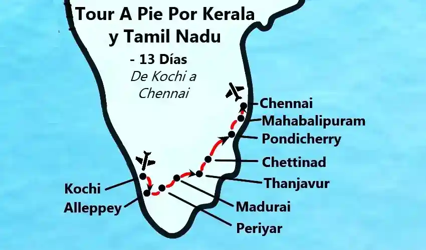 El tour comienza en Kochi y termina en Chennai. Recomendamos reservar un vuelo de ida y vuelta en abierto — volar al Aeropuerto Internacional de Cochin y salir desde el Aeropuerto Internacional de Chennai. Este recorrido sigue el arco natural del viaje y evita cualquier vuelta atrás. TTI te recibe en el aeropuerto de Kochi desde el momento en que llegas.