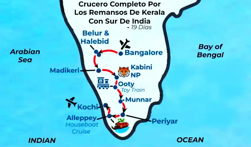 ​​​​​​​Vuelos: El tour comienza en Bangalore y termina en Kochi. Se recomiendan vuelos de ida y vuelta en abierto — llega a Bangalore, sale desde Kochi.