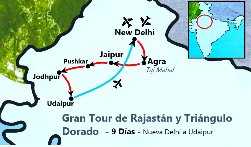 Es un viaje de 9 días por Delhi, Agra, Jaipur, Pushkar, Jodhpur y Udaipur que combina el Triángulo Dorado con la herencia real de Rajastán.