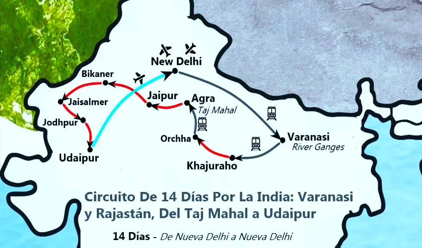 El itinerario incluye Delhi, Varanasi, Khajuraho, Orchha, Agra, Jaipur, Bikaner, Jaisalmer, Jodhpur y Udaipur.